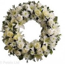 Celebrate someone's life and remember the happy days together with this bright wreath of white flowers. ..